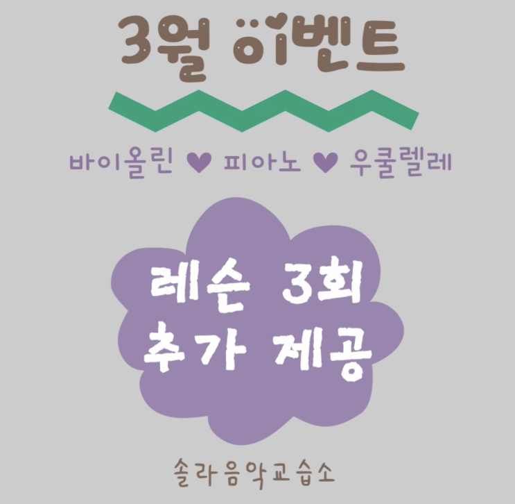 안녕하세요 ~ 3월마다 솔라음악교습소에서는 추가레슨 3회의 혜택을 드립니다 따뜻한 봄날 즐거운 음악으로 추가레슨 3회와 함께 실력도 탄탄하게 키워보세요 솔라음악교습소의 특별함을 소개합니다 체계적이고 효과적인 레슨을 위해 ~~ ■ 1:1일 맞춤 밀착레슨 ■ 연습관리 ■ 유튜브 동영상으로 연습음원 제공 ■ 레슨 후 피드백 제공 ■ 솔라쌤이 직접 만든 악보 제공 ■ 피아노 반주가 함께 하는 바이올린 수업 제공 솔라의 음악교육마인드 < 천천히 그러나 바르고 즐겁게 > 솔라는 1층에 있어서 주차 및 등하원이 안전하고 편리합니다 학원 바로 앞 예쁜카페가 있어서 학부모님이 기다리시기에 좋습니다....... <img src="https://blogthumb.pstatic.net/MjAyNjAzMTFfMTcz/MDAxNzczMjE5MzE4OTU0.xwmTMAOpt02Ytf3bsOz5oxu0ZAyp9iUL4e13a_ZEl-4g.-bu5vTSd7T4dU0oX12xPidAzvXOu_uTNeBi0xpHgOuQg.PNG/image.png?type=s3" />