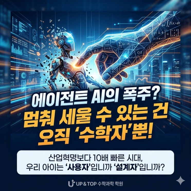 에이전트 AI의 폭주? 인공지능 시대를 지배하는 건 결국 '수학자'들입니다. 안녕하세요, 업앤탑 수학과학 학원입니다. 최근 IT 업계의 최대 화두는 단연 ‘에이전트AI(Agentic AI)’입니다. 단순히 질문에 답만 하던 챗봇이 '아르바이트생'이라면, 에이전트 AI는 스스로 계획을 세우고 실행까지 완수하는 '전문 비서'에 가깝습니다. [참고] 에이전트 AI가 무엇인지 더 궁금하시다면? (이전 포스팅 보기) 맥킨지 연구소에 따르면, 현재 AI 기술의 진화 속도는 산업혁명보다 10배나 빠르고 그 파급력은 무려 3,000배에 달한다고 합니다. 하지만 이 압도적인 속도 뒤에는 우리가 반드시 짚고 넘어가야 할 '....... <img src="https://blogthumb.pstatic.net/MjAyNjAzMTFfMjA1/MDAxNzczMjI3OTk0MjU3.NAUx6rzQy18FQGgywUJCZYyXHTbbB5lVSQHWnkxqU-Qg.UhsHQ3atnKJXpxCXu95KxwlMWF71IesuE26h7M1UOgYg.JPEG/IMG%A3%DF5419.jpg?type=s3" />