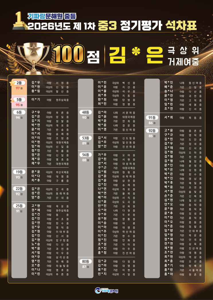 학년이 바뀌고 처음으로 치른 정기평가입니다. 중3 학생들은 입시에 한 발 더 다가선 만큼 순위권 학생들의 전국 석차가 발표되는데요. 달서원 중3들은 하나같이 실력파들이라 많은 학생들이 명단에 올라갔습니다. (원장쌤이 피자 쏜다!) 올해부터 중3들도 독서 파트가 생겨서 아이들과 함께 책을 읽고 있는데요. 독서 시간이 부족해서 힘들어하진 않을까 우려했으나 각자 책을 읽으며 느낀 점 등 서로의 의견을 나누며 수업에 더욱 적극적으로 참여합니다! 바쁜 와중에도 함께 하는 독서가 기파랑 학생들에게 때로는 힐링이 되고 넓은 세상에 더 단단하게 설 수 있게 해 줄 것이라 믿어 의심치 않습니다! 남은 과정 잘 마무리하여 졸업시험 (수....... <img src="https://blogthumb.pstatic.net/MjAyNjAzMTJfOTIg/MDAxNzczMjk4MDMyMzk2.qUNqCAh4gRos8hGIldVdVhDT1AUhjAwGIHQISzi-CREg.rcMlMPQ1F44JF3hv72uLIZffsOtLsJ-xG3wrzn0tL80g.PNG/472.png?type=s3" />
