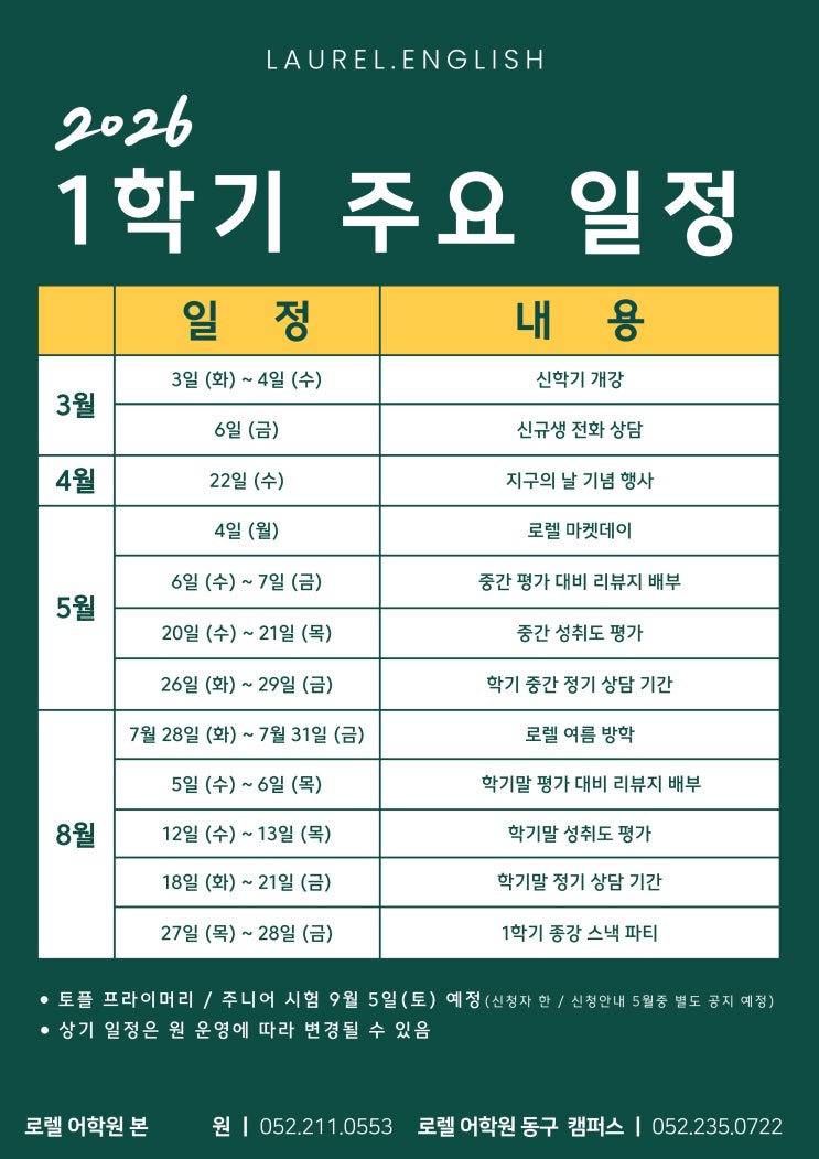 울산 중구 영어학원 우정혁신도시 로렐 어학원 2026학년도 1학기 주요일정