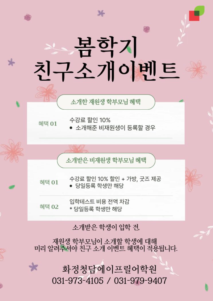 안녕하세요! 화정 청담 에이프릴 어학원입니다. 새 학기가 시작되면서 우리 아이들의 영어 실력 향상을 위해 고민 중인 학부모님들이 많으실 텐데요. 청담, 에이프릴어학원의 체계적인 커리큘럼을 주변 지인분들께 자신 있게 추천해 주시는 학부모님들께 감사의 마음을 담아, '친구 소개 특별 이벤트'를 진행합니다! 소개해 주시는 분과 소개받고 새로 오시는 분 모두에게 실질적인 혜택을 드리고 있으니, 아래 내용을 확인해 보시고 풍성한 혜택을 꼭 챙겨가시길 바랍니다. ✨ 친구 소개 이벤트 혜택 안내 1️⃣ 기존 재원생 학부모님을 위한 혜택 평소 저희 학원을 믿고 아이를 맡겨주시는 학부모님들께 드리는 감사의 선물입니....... <img src="https://blogthumb.pstatic.net/MjAyNjAzMTZfMTQy/MDAxNzczNjY1NDQ2MzYz.3E05iRth-bV4OH8OZ529i6Mo7bKQlGJp66YKVSYXoowg.eztU4PtjVoLic7dBnoX8HORnp-LP-GcPw1cVEE60XGcg.PNG/%C4%A3%B1%B8%BC%D2%B0%B3%C0%CC%BA%A5%C6%AE_%287%29.png?type=s3" />