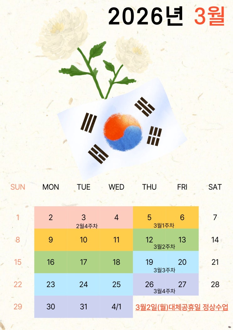안녕하세요 최선어학원 구리남양주캠퍼스입니다 3월 일정 안내드립니다. 2월 24일~3월 9일 초/중등 에세이 1분기 4회차 3월 2일 3.1절 대체 공휴일 3월 10일~3월 23일 초/중등 에세이 1분기 5회차 3월 24일~4월 6일 초/중등 에세이 2분기 1회차 월 교습비 32만원 학원등록번호 : 제4387호 <img src="https://blogthumb.pstatic.net/MjAyNjAyMjNfMjMx/MDAxNzcxODE5NzA3OTE4.XGHs72zyobrM0t--SGej89aga_YBoqzaQJDZkxrV7wYg.yXWecSvDaDzvEY-mpvlbNnkTUUGTHc8zp1nRpF_0cgQg.JPEG/2026_3%BF%F9_%C0%CF%C1%A4_%BE%C8%B3%BB_%283%29.jpg?type=s3" />