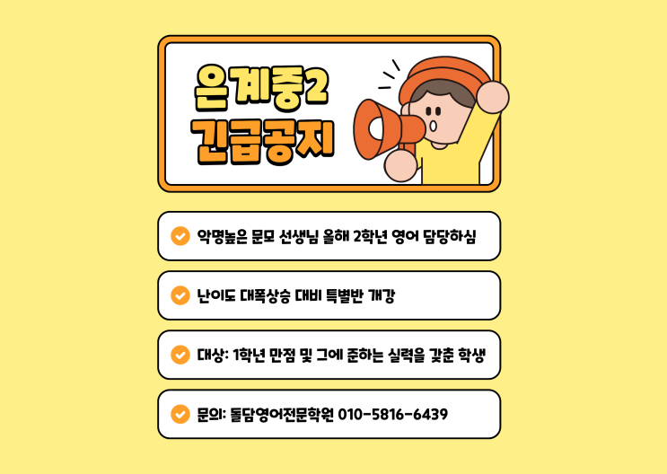 아는 사람은 다 안다는 은계중 문모 영어선생님 지난해 3학년 맡으시면서 만점은 고사하고 대부분 90점도 못넘기게 하셨다는 그 분 바로 그분이 올해는 2학년 영어를 맡으셨습니다 아이들에게 공개적으로 시험이 어려울거라 선전포고 하셨다네요 이제 2학년 중간고사 영어시험이 매우 어려울 거라는 건 기정사실 이에 대한 제대로 된 준비가 없다면 결과는 안봐도 비디오~ 그래서 돌담학원이 은계중2 특별반~을 개강합니다 목표는 90점 이상 90점만 넘어도 아마 전교 열손가락 안에 들겁니다~ 돌담에서 제대로 준비해 보아요!!! 문의: 010-5816-6439 <img src="https://blogthumb.pstatic.net/MjAyNjAzMDdfNDAg/MDAxNzcyODczOTA4NDQ4.BeMev95Zbrs_iBz4PZGudMosuQtEb6pYOvtV4SBMN_8g.EwG7fk1aDCD4FmPibvnsHiSTpOdmJdxwPUAhzCkbhVkg.PNG/%C0%BA%B0%E8%C1%DF2%B1%E4%B1%DE%B0%F8%C1%F6.png?type=s3" />
