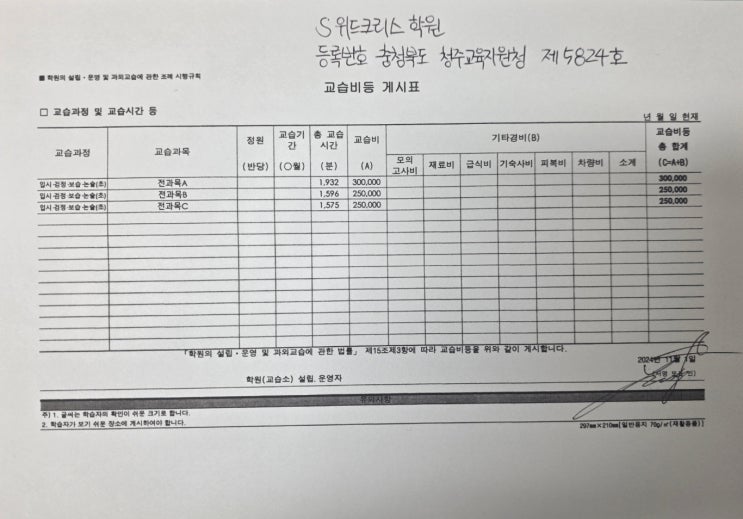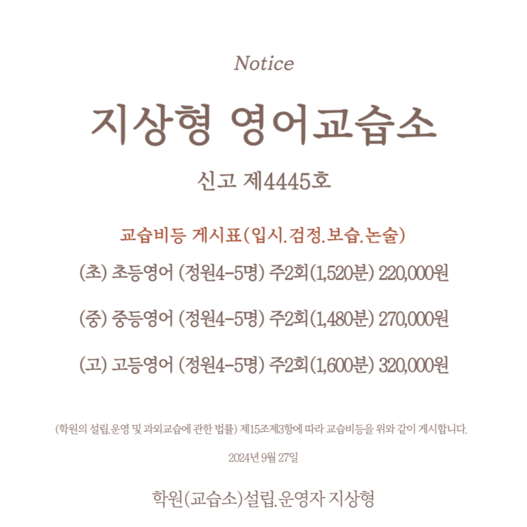 -Notice 지상형 영어교습소 교습비 안내입니다.-