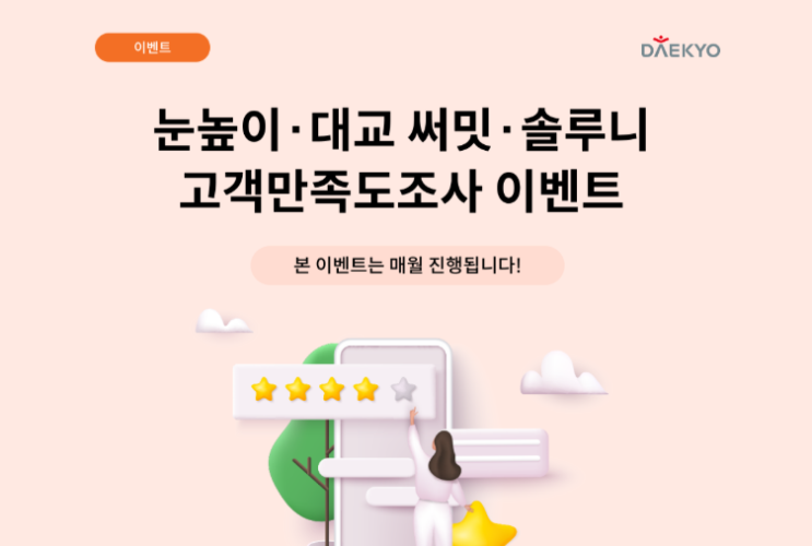안녕하세요? 눈높이 러닝센터 천안 더좋은 학원입니다. 이번 달 대교와 함께한 학습은 어떠셨나요? 보다 좋은 환경에서 학습하실 수 있도록 의견을 듣고자 고객 만족도 조사를 진행합니다. 조사에 참여하시어 소중한 의견을 들려주세요! 눈높이, 대교 써밋을 이용하시는 학부모, 회원(성인)께서는 2026년 3월 고객 만족도 조사에 참여하시어 소중한 의견을 남겨주세요. 500분을 추첨하여 모바일문화상품권(3천원)을 드립니다. 기간: 2026년 3월 15 ~ 31일까지 상품: 모바일문화상품권 3천원권 (매월 최대 500명 추첨) 발표: ‘26년 4월 중 발표 예정 ※ 본 이벤트는 대교가 만든 교육통합서비스플랫폼 ‘마카다미아’에서 참여할....... <img src="https://blogthumb.pstatic.net/MjAyNjAzMTdfMjE5/MDAxNzczNzMxNjMyMzg1.I1a0DGPmXFX6jPMocej9CWOYLVRhU0BYIzldTSoOC3gg.NSq7kia8pKqSJX9cOBmf_2sFLYIW1hD61enaAlGPm8Yg.PNG/image.png?type=s3" />
