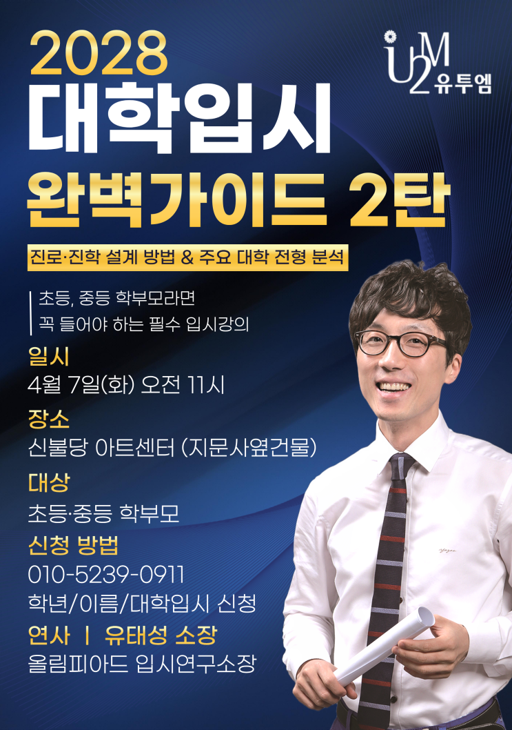 유태성 소장 초청 입시설명회 2탄 안녕하세요, 불당 유투엠입니다 :) 작년, 많은 학부모님들께서 “이 강의는 꼭 다시 열어달라”고 요청해주셨던 바로 그 강연, 유태성 소장님 입시설명회 2탄이 드디어 진행됩니다. 왜 이 설명회인가요? 2025년 진행된 강연에서 학부모님들의 만족도가 매우 높았던 이유는 단 하나입니다. “입시를 정확하게 꿰뚫는 설명” 단순한 정보 전달이 아닌, -앞으로 바뀌는 입시 구조 -우리 아이에게 맞는 진로 방향 -지금 반드시 준비해야 할 핵심 전략 을 명확하고 현실적으로 짚어주는 강연이었기 때문입니다. 이번 강연에서 얻어가실 것 이번 2탄에서는 더욱 깊이 있는 내용으로 진행됩니다. - 초등·중등 시기별 진....... <img src="https://blogthumb.pstatic.net/MjAyNjAzMThfNTEg/MDAxNzczODI5NDU3Nzk4.pZR12didxat-X0ibcDr6dRHZJoiP4AvUupDVauZeCKog.31tvtQ_96nS8feFVkQ8NYPH2Wn5Vdg_djUOAZicTcN8g.PNG/KakaoTalk_20260317_194901482.png?type=s3" />