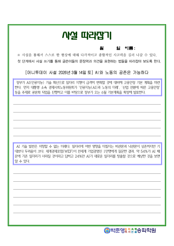 2026년 3월 14일 사설 과제입니다. 첨부 파일 확인바랍니다. <img src="https://blogthumb.pstatic.net/MjAyNjAzMTRfMTM0/MDAxNzczNDQxMTA2NDAz.47oppGI1zQ0qFTOWWhsxdsLjVewdgN3YtoPd5rBRnAMg.tMYvXH9amV-uZjPvGPrTjU6V5wkgb2GlDmB1w9SlRNsg.GIF/01.gif?type=s3" />