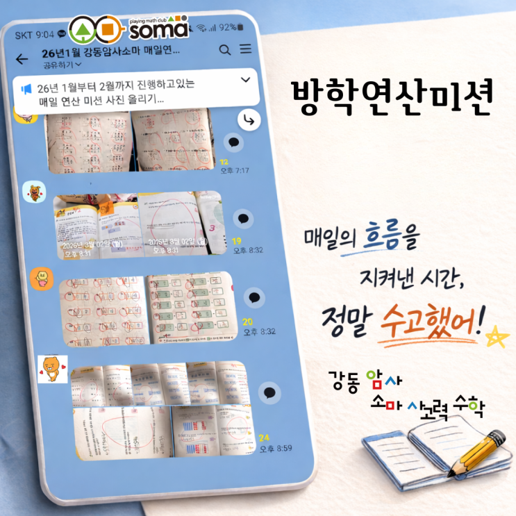 이번 방학 동안 조용하지만 단단하게 연산의 흐름을 이어온 시간들이 있었습니다. 빠르게 푸는 연산이 아니라, 잘하는 아이를 가려내는 미션이 아니라, 매일 책을 펴는 힘 흐름을 끊지 않는 힘 그것을 연습하는 시간이었습니다. 오픈 채팅방 안은 한 장의 인증 사진, 짧은 체크 하나가 서로에게 작은 자극이 되었을 거라 믿습니다. 방학 미션 참여 친구들에게 이번 미션에 참여한 친구들에게는 저희가 마련한 학용품을 내일부터 배부하려 합니다. 비싼 선물은 아니지만 ✔ 끝까지 해낸 시간 ✔ 흐름을 지켜낸 태도 그 시간을 기념하는 작은 표시입니다. “지속한 태도”에 대한 격려입니다. 그리고 이제, 월간 연산 미션으로 갑니다 방학 이벤트....... <img src="https://blogthumb.pstatic.net/MjAyNjAzMDJfMTk3/MDAxNzcyNDU2NDExNjk1.YLrhzwqNAYM8c9dbNQ7udzsqhzwQQsP89hxGVyjFbXMg.7fXmrt790e-NDo-SvcQn1g0BQTyk6eUZd-_NnR3FSbYg.PNG/2.png?type=s3" />