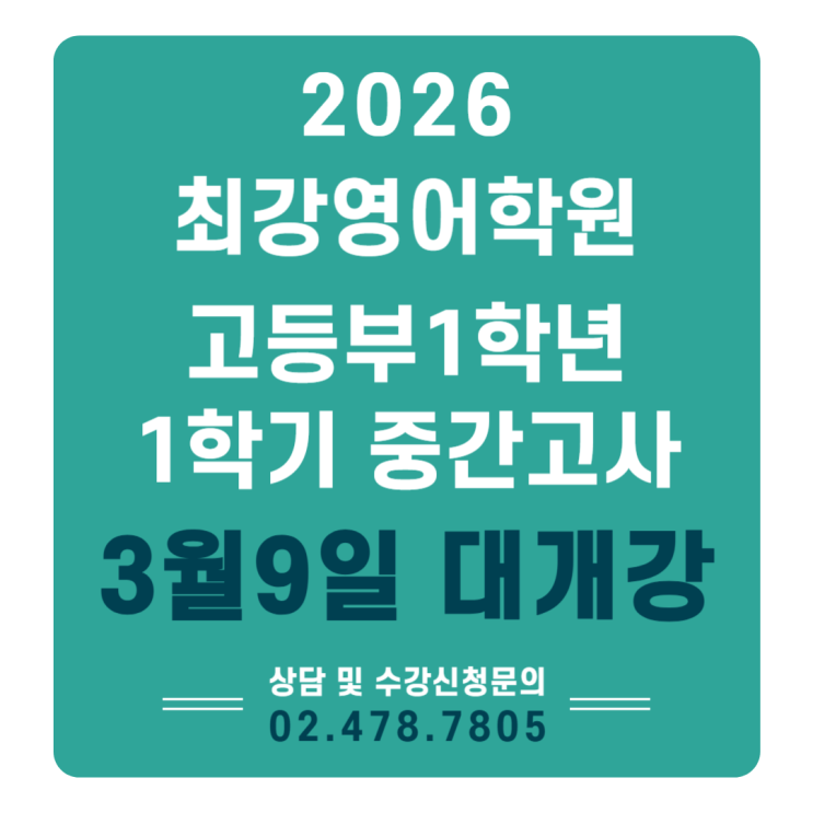 최강영어학원 고등부 1학년 1학년 첫 중간고사 내신대비 3월 9일 대개강 고등학교에 입학한 지 얼마 되지 않은 지금, 아이들에게 가장 중요한 것은 첫 중간고사 준비 방향을 제대로 잡는 것입니다. 고1 첫 내신은 단순한 한 번의 시험이 아닙니다. 앞으로 3년간의 내신 흐름을 결정짓는 출발점이며, 학생 스스로도 “나는 어느 정도까지 해낼 수 있는가”를 확인하는 중요한 시험입니다. 최강영어학원은 3월 9일부터 고등부 1학년 학교별 맞춤 내신대비 수업을 본격적으로 시작합니다. ■ 왜 ‘지금’부터 준비해야 할까요? 고등 영어는 중등과 완전히 다릅니다. 시험 범위의 깊이 서술형 비중 증가 학교별 출제 스타일 차이 변형 문제 난이....... <img src="https://blogthumb.pstatic.net/MjAyNjAzMDJfMjUg/MDAxNzcyMzgxNjQ5NDM3.0XVYvrpMkuGIjmp3agQDGHILzIP1PnAJHL_fL2Z6tAog.nCAC3rbwBcI2gS505D6lBZx1e6NMVHyXh1IzOW8wkqEg.PNG/%B0%DC%BF%EF%C6%AF%B0%AD_%BA%B9%BB%E7%BA%BB-003.png?type=s3" />