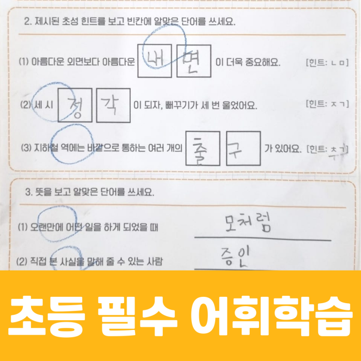 아이들의 문해력에서 가장 중요한 기초는 바로 어휘력입니다. 글을 이해하는 힘은 결국 얼마나 많은 단어를 알고, 그 뜻을 정확히 이해하느냐에서 시작되기 때문입니다. 리틀러시에서는 초등학생들이 탄탄한 어휘 기초를 만들 수 있도록 국립국어원에서 제시한 국어 기초 어휘를 바탕으로 연간 총 960개의 필수 단어를 학습하는 월별 필수 어휘 노트를 활용하고 있습니다. 그리고 수업 시간마다 어휘 테스트를 통해 ✔ 단어의 뜻 이해 ✔ 문장 속 활용 ✔ 초성 힌트를 통한 단어 찾기 등 다양한 방식으로 아이들이 단어를 정확히 익히도록 지도하고 있습니다. 위 학생 역시 처음에는 ✔ 단어 쓰기 ✔ 문장 이해 부분에서 틀리는 문제들이 꽤 있었....... <img src="https://blogthumb.pstatic.net/MjAyNjAzMDZfMjk3/MDAxNzcyNzg5ODk1NzUy.pqk-prw81bzKhSM_WGHq0zSC7eype9UTH70VKHgd0RYg.AR5awBjLmkXqbapAKqebObZ_whLMpWUrtEvSEth4qKMg.PNG/2.%C7%D1%B1%B9%BB%E7_%C8%AB%BA%B8_%BA%ED%B7%CE%B1%D7%BF%EB_%283%29.png?type=s3" />