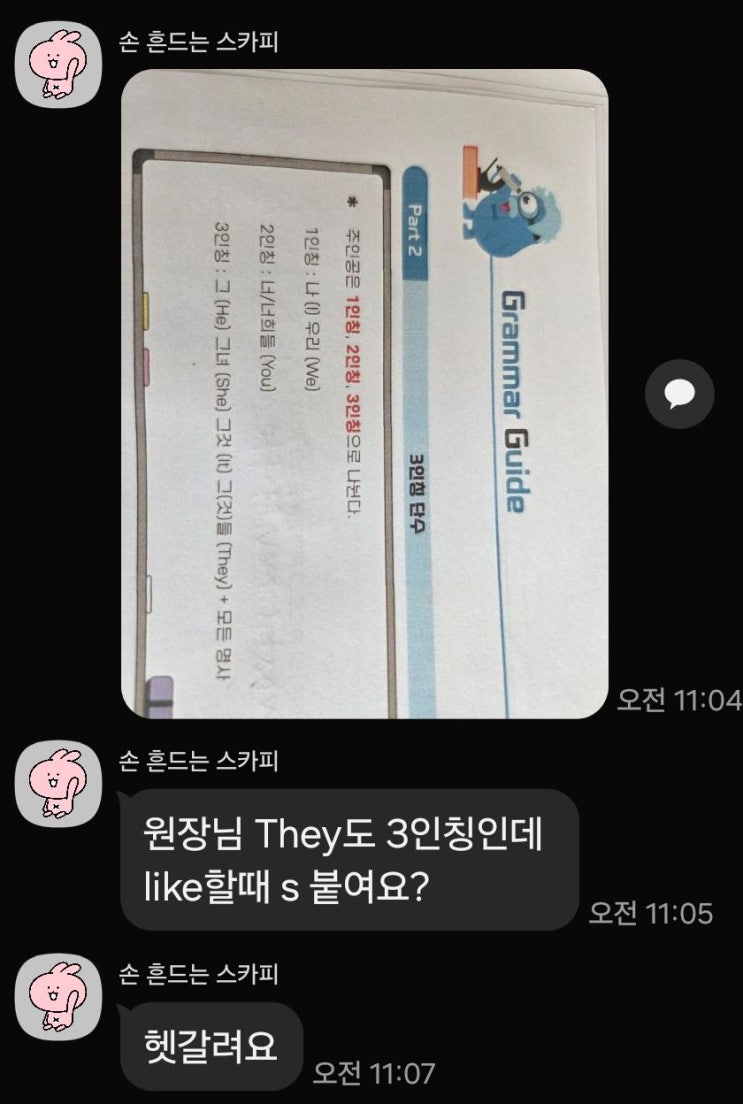 안녕하세요. 영어하브루타 공부법 저자& 파머스 영어학원장 오혜승Cindy입니다. 혹시 우리 아이들 영어 공부할 때, 분명히 배운 문법인데 자꾸 헷갈려 하진 않던가요? 그럴 때 여러분은 어떻게 반응하시나요? 오늘 저희 진영 파머스 어학원의 혀니가 저에게 질문을 던졌어요. 원장님, They도 3인칭인데 like 할 때 s 붙여요? 헷갈려요 많은 아이가 겪는 혼란입니다. 이때 학원에서는 어떻게 대답해 주어야 할까요? "그냥 외워!" vs "왜 그럴까?" 대부분의 학원에서는 아이가 틀리거나 질문하면 이렇게 답하곤 합니다. They는 복수잖아. 3인칭 단수일 때만 s 붙이라고 했지?" "말해줬어, 안 해줬어? 다시 외워....... <img src="https://blogthumb.pstatic.net/MjAyNjAzMDhfMjM4/MDAxNzcyODk3Nzg3MDEx.gqkRFEXANEQDpsUY_GyVlx27mH87d1vkxH9er6-_ZEAg.oI0N1z3quBBg7j8v47iicOrntwENEPnuVQa6TKV-PRUg.JPEG/1772876833165.jpg?type=s3" />