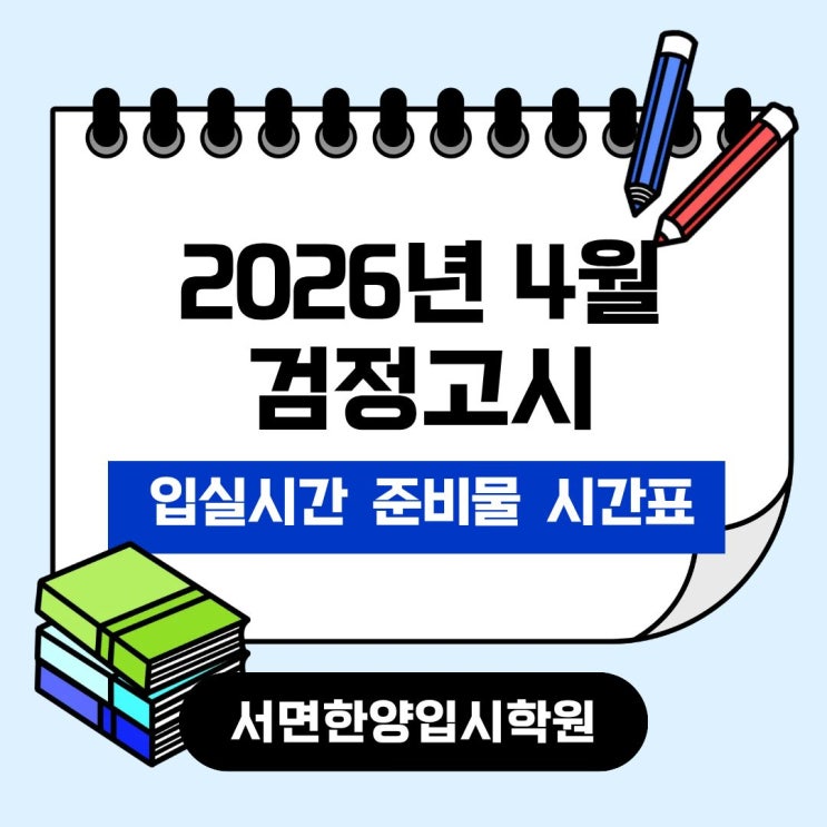 2026년 4월 검정고시도 어느덧 약 3주 앞으로 다가왔습니다 다가오는 2026년 4월 검정고시를 준비하는 분들을 위해 시험 입실시간, 준비물, 시험 과목, 시간표를 한 번에 정리해 드리겠습니다 2026년 4월 검정고시 시험일 : 2026년 4월 4일 (토) 입실 시간 : 08:30까지 ※ 1교시 시험 시작 후에는 입실이 제한 될 수 있습니다 2026년 4월 검정고시 시간표 1교시 응시자는 당일 8시30분까지 지정된 시험실에 입실해야 합니다 시험 중에는 중간 입실이 당연히 불가합니다 2026년 4월 검정고시 준비물 ★ 초졸 : 수험표,신분증.흑색볼펜 (아날로그 손목시계 가능) ★중졸 고졸 : 신분증 (주민등록증.여권,청소년증),수험표,컴퓨터용 사인펜,흑색사인....... <img src="https://blogthumb.pstatic.net/MjAyNjAzMTNfMjEy/MDAxNzczMzg4MDc5MTI5.LVnCqO6347knFtiekLxugp-wQcp-b4_3b-IfwC1iiUog.32hq8WA9dtCB6fiGhfzrQnkMnIrGygM48B0Q2d__e8Mg.JPEG/0313.jpg?type=s3" />