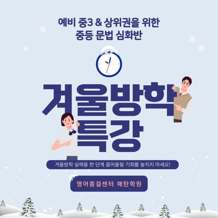 예비 중3 & 상위권을 위한 중등 문법 심화반 겨울방학 특강 오늘은 예비 중3, 그리고 중등 상위권 학생들을 위한 겨울방학 문법 심화반 특강 소식을 안내해 드리려고 해요. 우리 학원에서 착실히 쌓아온 친구들이 드디어 중학교 마지막 학년, 그리고 고등 영어로 넘어가는 관문을 앞두고 있습니다. 이 겨울방학이 얼마나 중요한지, 수년간 중고등 내신과 입시 영어를 함께 해온 경험으로 말씀드릴 수 있어요. ❄️ 예비 중3 겨울방학, 왜 문법 심화가 꼭 필요할까요? 중3은 단지 학년 하나 올라가는 것이 아닙니다. 그 시점부터 영어 학습은 ‘고등 학습의 방식’ 으로 서서히 전환됩니다. 초등 영어는 익숙해지는 것에 중점을 두고, 중....... <img src="https://blogthumb.pstatic.net/MjAyNTEyMTdfNDIg/MDAxNzY1OTYxMTMwMjA5.cHFSjZL3ffMufmj55KrjhU5VYssIQPdm5R25AeM9PrUg.FW_poLSgPEhONVEMTdiX_tCZqUHU2aYyzwWqgST-k1Ag.JPEG/%C7%CF%B4%C3%BB%F6_%B0%DC%BF%EF%B9%E6%C7%D0_%C7%D0%BF%F8_%BC%F6%BE%F7_%C8%AB%BA%B8_%C0%CE%BD%BA%C5%B8%B1%D7%B7%A5_%B0%D4%BD%C3%B9%B0_%286%29.jpg?type=s3" />