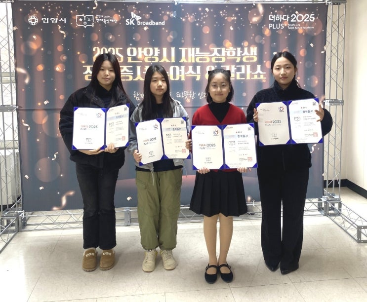 청소년음악제 안양시장상 수상! 청소년음악제 국회의원상 수상! 무대에 서는 순간까지 정말 열심히 연습했어요. 떨리는 마음도 멋지게 이겨내고, 자신만의 음악으로 끝까지 최선을 다한 자랑스런 우리 아이들❤️ 앞으로도 음악을 사랑하는 마음 그대로 더 멋진 길을 걸어가길 응원합니다. ✨ <img src="https://phinf.pstatic.net/image.nmv/blog_2025_12_12_1838/bkzwa8mZl0_03.jpg?type=f480x480" />