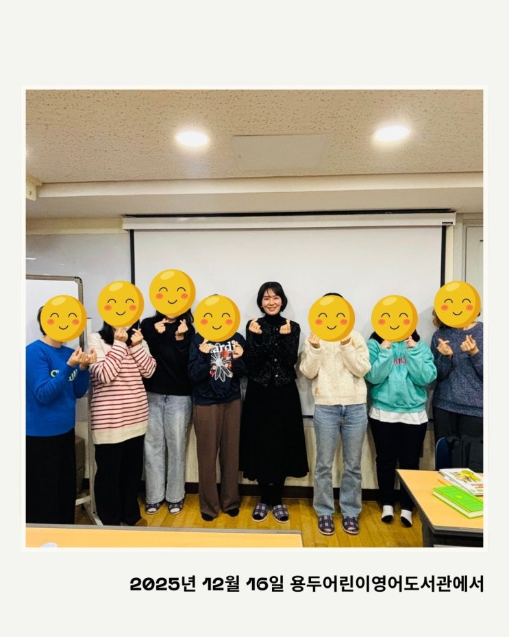 안녕하세요. 프리미엄 영어교육을 돕는 헤라입니다. 오늘은 저에게 있었던 감사한 하루를 나누려고 해요:) 제가 작년 12월에 처음 용두어린이영어도서관에서 어머님들을 대상으로 겨울방학 영어독서지도법에 대한 원데이 수업을 했어요. 어느덧 1년이 지났어요. 지난 1년 동안 겨울학기, 봄 학기, 여름학기, 가을학기까지 총 4학기를 도서관 문화강좌 수업을 했어요. 그리고, 오늘 용두어린이영어도서관에서 가을학기 마지막 문화강좌 수업을 했어요. 2025년 용두어린이영어도서관 문화강좌는 1학기당 10주 동안 1시간 30분 수업이었어요. 10주 동안 귀한 시간을 저와 함께해 주셔서 진심으로 감사드립니다. 그리고 저에게 귀한 말씀과 편지까지....... <img src="https://blogthumb.pstatic.net/MjAyNTEyMTZfNDcg/MDAxNzY1ODg3NDk3MTM1.oK8OEaA8r3btsEfCZf5-R3yGHxJhZQrkOYWmR6fKQrYg.of1_gnj7TCYPLdg4TjW6HCJ-KE90w_5WAbVroVK0h9Qg.JPEG/%BF%EB%B5%CE%BE%EE%B8%B0%C0%CC%BF%B5%BE%EE%B5%B5%BC%AD%B0%FC_%BE%EE%B8%D3%B4%D4%B5%E9%B0%FA.jpg?type=s3" />
