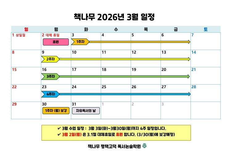 안녕하세요. 책나무 평택고덕 독서논술입니다. 아이들의 성장을 함께 지켜보며 늘 믿고 응원해 주신 학부모님께 진심으로 감사드립니다. 2026년 3월 일정 안내드립니다. 3월 수업 일정 안내 ✔️ 3/3(화) ~ 3/30(월)까지 4주 수업입니다. ✔️3/31(화)는 자유독서의 날로, 아이들이 자유롭게 독서하는 날입니다. (보강이 필요한 경우 해당일에 보강 진행) ✔️ 3월2일(월) 은 삼일절 대체휴무로 휴원 합니다. ✔️ 수업 결석이나 일정 변경이 필요한 경우, 미리 학원으로 연락 주시길 부탁드립니다. 믿고 맡겨주시는 모든 학부모님께 진심으로 감사드리며, 책나무는 아이들이 바르게 생각하고 따뜻하게 자라날 수 있도록 언제나 최....... <img src="https://blogthumb.pstatic.net/MjAyNjAyMjdfMTA4/MDAxNzcyMTg1MjU1MDc4.arqp4nQRJbdVtmQm22uW8Kv2LUb3tWz8K00-WJpx4akg.35e3xbYGqplIVNu02tjQdTspFeFS_QEY0PzsQMEULqMg.JPEG/26%B3%E2_3%BF%F9_%B4%DE%B7%C2.jpg?type=s3" />