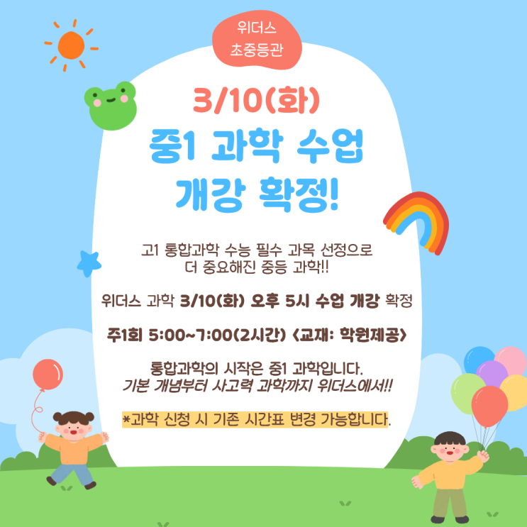 안녕하세요, 위더스 학원입니다. 중1 과학 수업 개강이 3/10(화) 오후 5시로 확정되었습니다. 상세 내용은 첨부해드린 이미지를 참고 부탁드립니다. 문의하실 사항이 있으신 경우 학원으로 편하게 전화 부탁드립니다. 많은 관심 부탁드립니다. 감사합니다. (위더스학원 ☎031-791-5876) <img src="https://blogthumb.pstatic.net/MjAyNjAzMDFfMjY1/MDAxNzcyMzQ0NjMxNDA4.8K8QR8t7_wZQbv4W_EoG8Doxnhq7sZqVjfUZefS02Eog.83NMW6kWl6Ndj21e_Wwvs9P7zGCjjYVxtMtD6Zl_2B8g.PNG/%C1%A6%B8%F1%C0%BB_%C0%D4%B7%C2%C7%D8%C1%D6%BC%BC%BF%E4._%2810%29.png?type=s3" />