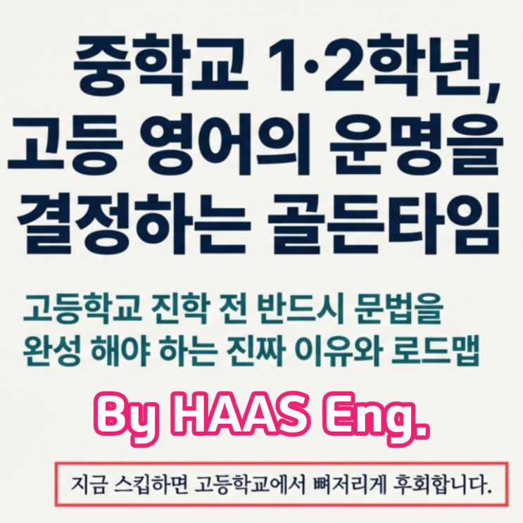 중학교 영어 80점 안심하고 계신가요? 고등영어에서 무너지는 결정적 이유와 해결방안 - 하스영어학원 안녕하세요, 하스영어학원입니다. :) 중학교 자녀를 둔 학부모님들, 아이의 성적표에 찍힌 'A' 혹은 'B'라는 등급을 보고 안심하고 계신가요? 혹시 "중학교 1학년은 자유학기제니까 좀 놀아도 되지 않을까?"라고 생각하시나요? 현장에서 수많은 학생을 지도하는 교육 전략가로서 단언컨대, 지금 그렇게 생각하고 계신다면 가장 위험한 '중등 영어의 함정'에 빠져 계신 것일지도 모릅니다. 오늘은 왜 중학교 성적이 고등학교 성적을 보장하지 않는지, 그리고 중 1, 2가 영어 공부의 '골든타임&#x....... <img src="https://blogthumb.pstatic.net/MjAyNjAzMDNfMTI3/MDAxNzcyNTAzMDU3NzA3.KJuTTXhJOsFLvYgcLoXtdB6n-vS6MtzqQkyxU400b8wg.DFnAUDD20CBZvXdL0ZHTHaJzhZQLk_s8vU6n6AEP82sg.PNG/%B1%B8%BC%BA%C1%DF_%BE%F0%B5%BF%C1%DF_%C7%CF%BD%BA%BF%B5%BE%EE%C7%D0%BF%F8_001-1.png?type=s3" />
