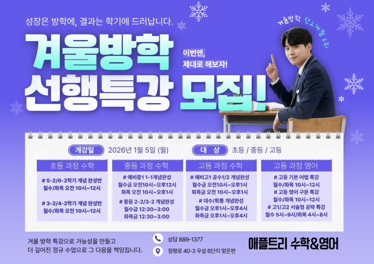 새 학년의 성적을 결정하는 첫 단추, 바로 이번 겨울입니다. 안녕하세요, 애플트리수학&영어입니다. 한 해를 마무리하고 새로운 학년을 준비하는 시기인 겨울방학이 얼마 남지 않았습니다. 학생들에게 겨울방학은 단순한 휴식의 시간이 아니라, 다음 학년을 어떻게 시작할지 결정하는 가장 중요한 전환점입니다. 애플트리에서는 초등 4학년부터 고등 2학년까지의 학생들을 대상으로 겨울방학 특강을 평일 오전 10시부터 진행합니다. 수업 시간표는 학년별 학습량과 과정에 맞추어 조정하여, 집중력을 유지하면서도 효율적인 학습 흐름을 만들 수 있도록 운영할 예정입니다. ❄️ 애플트리 겨울방학 특강 구성 1. 새 학년 선행 학습 체계적 진....... <img src="https://blogthumb.pstatic.net/MjAyNTEyMTVfMjc3/MDAxNzY1NzY2MDM1MDc2.nYKyZLRrpHTpL-IyGZPsOm1goQ3PG7Sz6ugKXnBKzqMg.5iLpgBfyXjOwJ6mFc1vhkdqaq7h6R4tgnMJR3SXGuPwg.PNG/2026_%B0%DC%BF%EF_%C6%AF%B0%AD_.png?type=s3" />