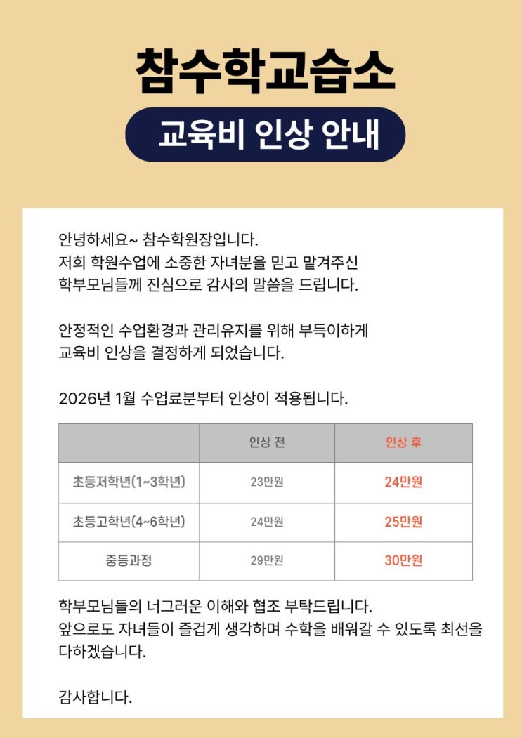 내년 2026년 1월 수업료부터 인상된 수업료가 적용됩니다. 신규회원분들은 올해 등록시 인상전 수업료로 1월 수업료가 결제됩니다. (2월부터는 2026년도 수업료비로 적용됨) 문의 사항 있으시면 전화나 문자 연락주시면 연락드리겠습니다. 010.2398.0880 (참수학교습소) 1층에 초록마을,2층에 국민은행 건물입니다. 참수학은 5층에 있습니다.^^ <img src="https://blogthumb.pstatic.net/MjAyNTEyMTZfMTQ1/MDAxNzY1ODYyMjg0NDQ0.EjK408azo02VYGiI_fC5KjyiCp1ydmS9GRN21xMke34g.vJXkMtgBE8Chl-xgULyBHxwk601WB4GeIXs1Wl7_Se0g.JPEG/%B1%B3%C0%B0%BA%F1%C0%CE%BB%F3_%BE%C8%B3%BB%B9%AE.jpg?type=s3" />