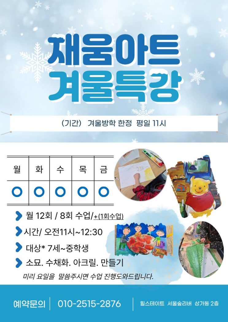 겨울방학 오전 시간, 그림·만들기 실력을 키우는 특별 클래스! 안녕하세요, 채움아트입니다 다가오는 겨울방학 동안 아이들이 규칙적으로 미술 수업을 듣고 실력을 확장할 수 있는 ‘겨울특강’을 준비했습니다. 조용하고 집중도 높은 오전 시간대에 진행되어, 학부모님 만족도가 특히 높은 프로그램이에요. 겨울특강 운영 안내 ✔️ 기간 겨울방학 한정 운영 ✔️ 시간 오전 11:00 ~ 오후 12:30 (90분 수업) 아이들이 가장 편안하게 집중할 수 있는 시간대입니다. ✔️ 요일 월 · 화 · 수 · 목 · 금 총 8회 / 12회 선택 수업 가능 (이미지 기준 동일) ✔️ 대상 7세 ~ 중학생 ✔️ 수업 구성 ✔ 수채화 ✔ 아크릴 ✔ 만들기(창작 활동....... <img src="https://blogthumb.pstatic.net/MjAyNTEyMTFfMjI2/MDAxNzY1NDIwODYzNjQ4.DUc5cWAD3EDOLB03iqekDPxFrlPbymb5z26jPRPxXqYg.vkv7L1QY4oxzP0z6PCd1Y-laWhwdrstMvKH24wZbbmQg.PNG/image.png?type=s3" />