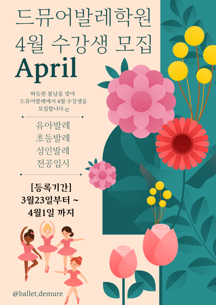 안녕하세요 ~ 드뮤어발레입니다:) 이제는 완연한 봄 날씨가 되어 두꺼운 겉옷들은 어느새 옷장 한구석으로 들어가 버리고 외출할때는 옷차림 또한 가벼워 졌습니다^^ 하지만 아직까지 아침,저녁으로는 일교차가 큰 만큼 건강관리에 유의하시고 음식을 섭취하기전에 한번 더 확인하고 먹는 습관이 필요해 지는 계절입니다^^ 봄이란 계절만큼 발레를 시작하는데 있어 이보다 좋은 계절은 없지 않을까 생각이드는데 따듯해지는 날씨만큼 발레와도 너무나 잘 어울리지 않나요??ㅎㅎ 다가오는 4월을 맞아 드뮤어발레에서 새로운 수강생을 모집합니다 ~~~~~~ ღ [등록기간] 3월 23일 부터 ~ 4월 1일 까지 유아,초등 취미발레부터 주부님들을 위한 성인....... <img src="https://blogthumb.pstatic.net/MjAyNjAzMTlfMTU4/MDAxNzczOTI2ODgzMTkx.0zVQ1YRWWo_6L9uERHK6dJgbWiRXALFQB_tdXRw9FSgg.HQlBm9kbNFXfy_Z9ztLYJCRRyf84N8BYknQge8FgHa0g.PNG/%B5%E5%B9%C2%BE%EE4%BF%F9%BC%F6%B0%AD%BB%FD%B8%F0%C1%FD.png?type=s3" />