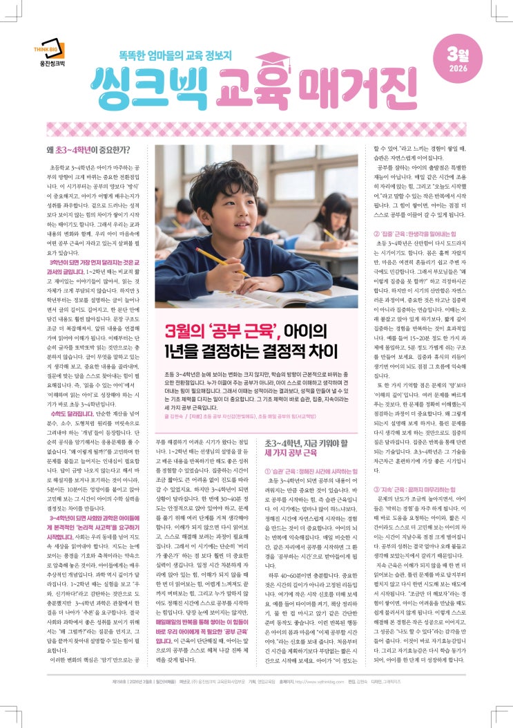 안녕하세요 :) 웅진씽크빅 양주지국 팀장입니다. 오늘은 아이들이 공부를 지루해하는 진짜 이유와 스스로 “해보고 싶은 공부”로 바뀌는 방법에 대해 함께 이야기해보려 합니다. 아이가 공부를 지루해하는 이유, 알고 계신가요? “이게 나중에 다 도움이 될 거야.” 부모님이라면 한 번쯤 해보셨을 말이죠. 하지만 아이들에게는 ▶너무 먼 미래 이야기라 와닿지 않습니다. 그래서 공부는 ✔ 지루하고 ✔ 의미 없는 일처럼 느껴질 수 있어요. 게임은 좋아하는데, 공부는 싫어하는 이유 아이들이 게임에 빠지는 이유는 단순합니다. ✔ 바로 보상 ✔ 눈에 보이는 성장 ✔ 즉각적인 성취감 게임에서는 → 몬스터를 잡으면 바로 “레벨업!” → 보상....... <img src="https://blogthumb.pstatic.net/MjAyNjAzMTlfMjM5/MDAxNzczODkwNDAyNzUz.6bswubFCTKOCZprZGO9C4rjs14SoOQW8seimXRjP83Eg._dRK01LkRXkLF4TFbHct39Snd4gMYm_8eN_VHwR9hgsg.JPEG/2026_3%BF%F9%C8%A3_%BE%C5%C5%A9%BA%F2_%B1%B3%C0%B0%B8%C5%B0%C5%C1%F8_page-0001.jpg?type=s3" />