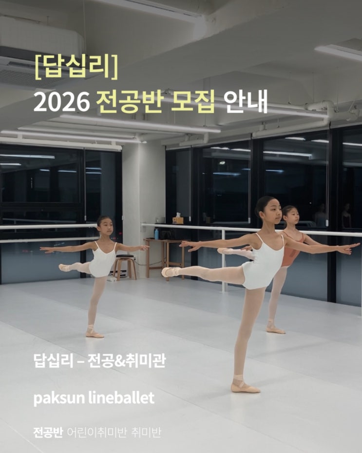 학원등록번호 : 제3478호 [답십리] 2026년 전공반 모집 안내 2026년부터 전공반에 함께 할 전공생을 모집합니다. ▪︎대상(초등) : 2026년 3학년 이상 ▪︎대상(중고등) : 2026년 중1 이상 ▪︎수업시간 - 월수금 : 초등 5:10~6:40 /중고등 7:0~8:30 - 화목 : 초중고 6:45~8:15 ▪︎수업료 : 월~금 월 60만원 전공에 대한 상담은 아래로 연락 주시어 원장 선생님과 약속을 잡아 상담해 주시기 바랍니다. 문의 • 인스타그램(@lineballet_paksun) dm • 카카오톡채널 “박선라인발레학원” • 02)2214-7773 ▪︎카카오톡채널 ▪︎인스타그램 ▪︎[답십리]박선라인발레학원 위치 <img src="https://blogthumb.pstatic.net/MjAyNTEyMThfOTgg/MDAxNzY2MDM5OTU0NDU0.Dm3M8L9YMlIG_USfUC-WY0e1I8FpvV8lMfDwi9d5APog.TPruJNQVZ5ZiUtZDPBB1-jecaDe-RWFnahIjudyghhIg.JPEG/900%A3%DF1766039585535.jpg?type=s3" />