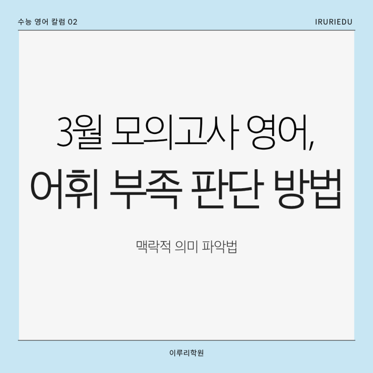 안녕하세요 이루리학원 컨설턴트 현건우입니다. 전편에 이어 이번에는 영어 어휘 수준 판별 및 어휘 접근법에 대해 다뤄보려 합니다. >이전 글 보러가기< 영어 독해의 첫 번째 기초 체력은 어휘입니다. 어휘가 안 되면 구문도, 독해도, 어법 판단도 전부 무력화됩니다. 그런데 많은 학생들이 어휘 공부를 잘못된 방식으로 합니다. 단어장을 펼치고, 영어 단어 옆에 적힌 한국어 뜻을 외웁니다. 그리고 "나 이 단어 안다"고 생각합니다. 시험에서 그 단어가 나오면 뜻을 떠올리는데, 정작 문장 속에서 그 단어가 어떤 의미로 쓰였는지는 잡지 못합니다. 어휘의 '사전적 의미'를 아는 것과, 문맥 속에서 '맥락적 의....... <img src="https://blogthumb.pstatic.net/MjAyNjAzMTZfMjAg/MDAxNzczNjYxNjk3MzY5.DCqE9DUca4wiuu8IasXQuDip1AHq_FjPnJOi6AyTrAQg.xkTvB9PC0bO2dg0ZGVnYnx9GP3QV80OK-Y2UA-t9prEg.PNG/1.png?type=s3" />