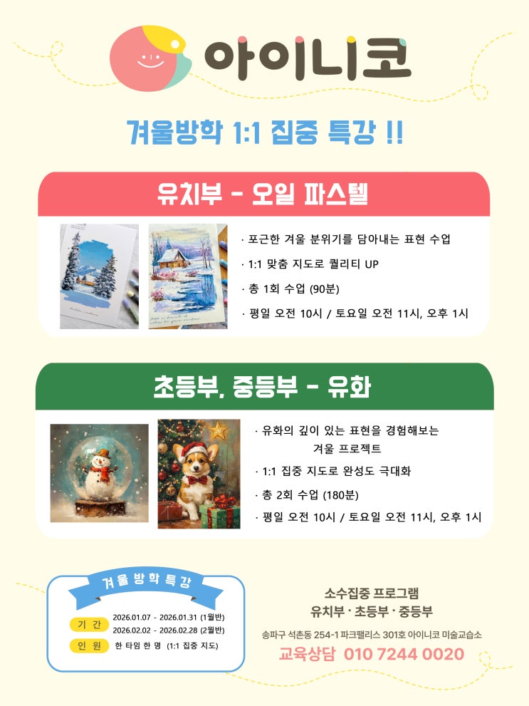 안녕하세요~! 모든 아이들이 '특별한 아이'가 될 수 있는 곳 아이니코(INIQO) 미술교습소입니다♥ 한 해의 마지막을 더 특별하게, 우리 아이들의 표현력과 창의력을 깊게 채워줄 겨울 아트 프로젝트가 열립니다 ·̩͙꒰ঌ( っ️˘꒳˘)っ*.+゚ 따뜻한 겨울 감성과 함께 아이들이 스스로 만족할 작품을 만들어가는 시간! 섬세한 1:1 집중 지도로 재료의 특성을 자세히 이해하고 고퀄리티 완성작을 진행합니다♥ 정원 제한이 있어 선착순으로 예약 진행되오니 특강을 희망하시는 분은 언제든 편하게 문의주세요 ꯁ.̮ꯁ 위치는 송파구 석촌동 254-1 파크팰리스 301호 가락초등학교와 해누리초등학교 사이에 있어요 ♥ 교육상담 010 . 724....... <img src="https://blogthumb.pstatic.net/MjAyNTEyMTJfMTMg/MDAxNzY1NTIwNTM5MjE2.9GOUiQDDe4D6Q3o9AbECefPL5jFwlFWEfJDDVOgUHV4g.YdS-79Cu7v7bzX-u23UaTgXnLLtD5JecQ_zQHUD2UnUg.JPEG/%B9%E6%C7%D0%C6%AF%B0%AD1.JPG?type=s3" />