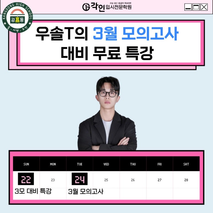 강동구 내신을 가장 잘 아는, 각인입시전문학원입니다. 고등학교 입학 후 처음 치르게 되는 3월 모의고사! 많은 1학년 학생들이 준비 방법을 몰라 막연한 부담을 느끼는 시험이기도 합니다. 그래서 각인 우솔쌤이 강동고 1학년 학생들을 위한 3월 모의고사 대비 무료 특강을 준비했습니다!!! 3월 모의고사, 왜 중요한가요? 3월 모의고사는 단순한 전국 시험이 아닙니다. ✔ 고등 영어 시험 유형 첫 경험 ✔ 시간 관리 능력 점검 ✔ 현재 실력 객관적 확인 ✔ 내신 대비 학습 방향 설정 처음 시험을 어떻게 시작하느냐에 따라 이후 성적 흐름이 크게 달라집니다. 우솔T의 3월 모의고사 대비 무료 특강 안내 일정 : 3월 22일(일) 오후 6시....... <img src="https://blogthumb.pstatic.net/MjAyNjAzMDNfMjgx/MDAxNzcyNTQwNzI3NDc1.1Yhd0M6nIQyvVeNsHHvt5gjB3LEFDVhC8QjV-fajNrAg.Eaj3vc2HvfsKi4lrgY14X1hBhDbyJroNIgkLKSOBGWgg.JPEG/%C1%A6%B8%F1%C0%BB_%C0%D4%B7%C2%C7%D8%C1%D6%BC%BC%BF%E4.-_%BA%B9%BB%E7%BA%BB_%281%29.jpg?type=s3" />