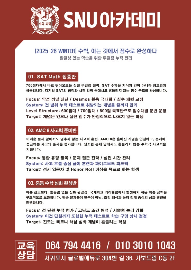 #에스엔유아카데미#제주국제학교수학 #에스엔유아카데미#제주국제학교수학 #에스엔유아카데미#제주국제학교수학 #SATMath800점전략 #디지털SAT수학집중반 #중등수학완결성훈련 #경시사고력준비반 #SATMath실전무결점 #AMC8 #수학누적관리시스템 #전범위누적테스트 #수학아는것과맞히는것 #에스엔유수학학원 #제주국제학교수학 #고난도조건해석훈련 #SNU학원 #수학적사고흐름훈련 #SATMath #국제학교수학선행보완 #에스엔유아카데미 #AMC #수학심화완결성 #미국수학 #디지털SAT #수학선행심화연결 #영어교육도시 #NLCS수학 #KIS수학 #SATMath점수구조완성 #BHA수학 #수학고난도서술형 #국제학교수학전문 #SJA수학 <img src="https://blogthumb.pstatic.net/MjAyNTEyMTdfNjMg/MDAxNzY1OTY4NTYxMzQy.9vooxptI0MXNSIAR7QMw__0judfPVKRmLAKuSt32kpsg.wjgPVb48se0pmJyuaMBuotkJ3SEzXyO-1gu1VPr_TNkg.JPEG/KakaoTalk_20251217_194558214.jpg?type=s3" />