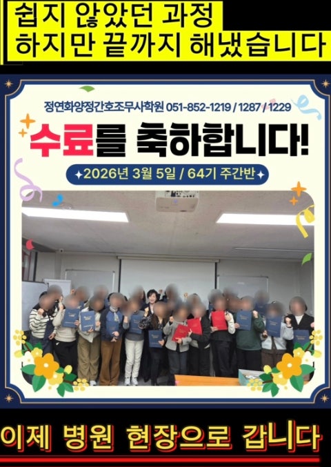 #정연화양정간호학원 #간호조무사학원 #간호조무사교육 #간호조무사취업 #부산간호학원 부산간호학원 -정연화양정간호학원 -병원인재양성전문기관은 3월5일(목) 간호조무사 주간반ㆍ속성반의 수료식을 진행하였습니다. [수료소식]간호조무사 64기 주간 속성반 수료식 [26년 3월5일]정연화양정간호학원 정연화양정간호조무사학원 부산간호학원 -정연화양정간호학원 2026년 3월 5일 정연화양정간호조무사학원에서 간호조무사 64기 주간 속성반 수료식이 진행되었습니다. 부산간호학원 -정연화양정수강생들은 오랜 시간 이론과 실습을 함께하며 의료현장을 준비해 온 수강생들이 또 한 번 의료인으로 새로운 출발을 하게 되었습니다. 간호조무사 64기....... <img src="https://blogthumb.pstatic.net/MjAyNjAzMDdfMjU5/MDAxNzcyODg1MjUyODYx.p3z42fbzNAjjwIUly0iXpLoc7m-kjaTpT2TuIrGhz1Qg.kLLB5PGao8m1rKKGNhoARsbQ_j_pYSJErI-SxHj309Eg.JPEG/480%A3%DFScreenshot%A3%DF20260307%A3%DF203504%A3%DFGallery.jpg?type=s3" />
