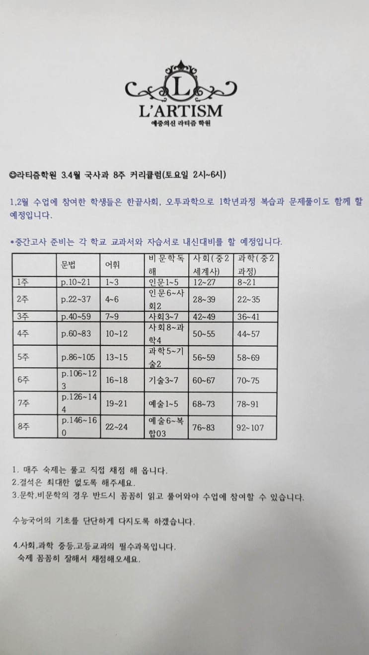 중고등 학생 대상 국사과 8주 특강을 시작합니다. 고등 통합사회의 기본이 되는 중등사회 1,2와 통합과학의 기본인 중등과학 1,2,3을 학년에 상관없이 수강할수있습니다. 시간: 토요일 오후2시~6시 장소: 분당 예중의 신 라티즘학원 본원 대상: 중1,2,3 /기초다지고싶은 고등학생 4시간을 알차게 달릴 예정입니다. 열심히 준비하도록하겠습니다!!! ▷ 교육문의 010.3436.8815 031.608.2226 ▷ 학원위치 경기 성남시 분당구 정자로 76번길 11 502호 (한양프라자) 예중의 신 라티즘 학원 #경기도 #성남시 #분당구 #정자동 #전과목 #국어 #영어 #수학 #사회 #과학 #내신전문 #예중입시 #예고입시 #초등 #중등 #고등 #수능 #모의고사 #학력평가 #예원....... <img src="https://blogthumb.pstatic.net/MjAyNjAzMDVfMjAy/MDAxNzcyNjk5MjQ0MjQy.jtPbbPUercmgGTlGY46z6KfoKGILt4Cn5Qh2HGS-oEUg.BTutazz0EhBpNq5Ue9j9hfngLKhomoiJxe_ntWgKwGgg.JPEG/20260304_212851.jpg?type=s3" />