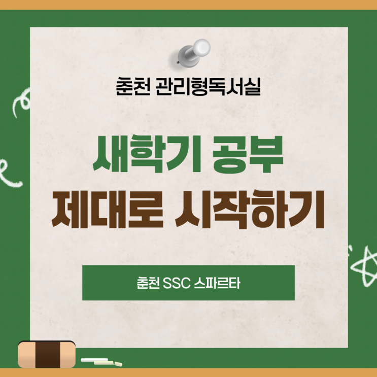 안녕하세요! 춘천 관리형독서실 SSC 스파르타입니다. 어느덧 3월, 새학기가 시작되었는데요. 새학기가 시작되면서 많은 수험생들이 다시 마음을 다잡고 있어요. “이번에는 제대로 공부해보자.” 새로운 계획을 세우고 책을 정리하며 공부를 시작하는데요. 하지만 막상 며칠 지나지 않아 혼자 공부하는 것이 생각보다 쉽지 않다는 것을 느끼게 됩니다. 집에서는 집중이 잘 안 되고, 카페에서는 오래 공부하기 어렵고, 일반 독서실에서는 스스로 모든 것을 관리해야 해서 어렵죠. 그래서 새학기가 시작되는 시기에 많은 수험생들이 춘천 관리형독서실 SSC 스파르타를 찾고 있어요. 새학기에 중요한 것은 공부 루틴 형성! 시험 준비에서 가장 중요....... <img src="https://blogthumb.pstatic.net/MjAyNjAzMDZfMTM5/MDAxNzcyNzc4MDkxMTQ5.gBG1mwFdZCtBJkPru75gYzk6rse0n0EXlv_mtBPyGkUg.1mmNCXzDh7cc_s3bFPohF_nDjeyDt5zEOkPYvSYeesEg.PNG/1.png?type=s3" />