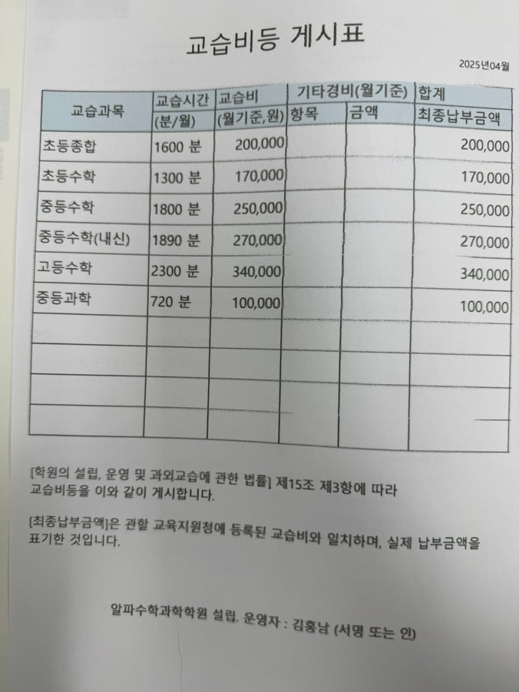 알파수학 수강료 안내 <img src="https://blogthumb.pstatic.net/MjAyNjAzMDNfMTAx/MDAxNzcyNTE2NjM4MTA4.PQlIG1h9oUaxlTgSKvuQqsbm66wKDokca_4ZVwomhP4g.UHMveXucI5MSUWPaab2-vOohrljBKF2DF_AEkjwkf6wg.JPEG/IMG%A3%DF5386.jpg?type=s3" />