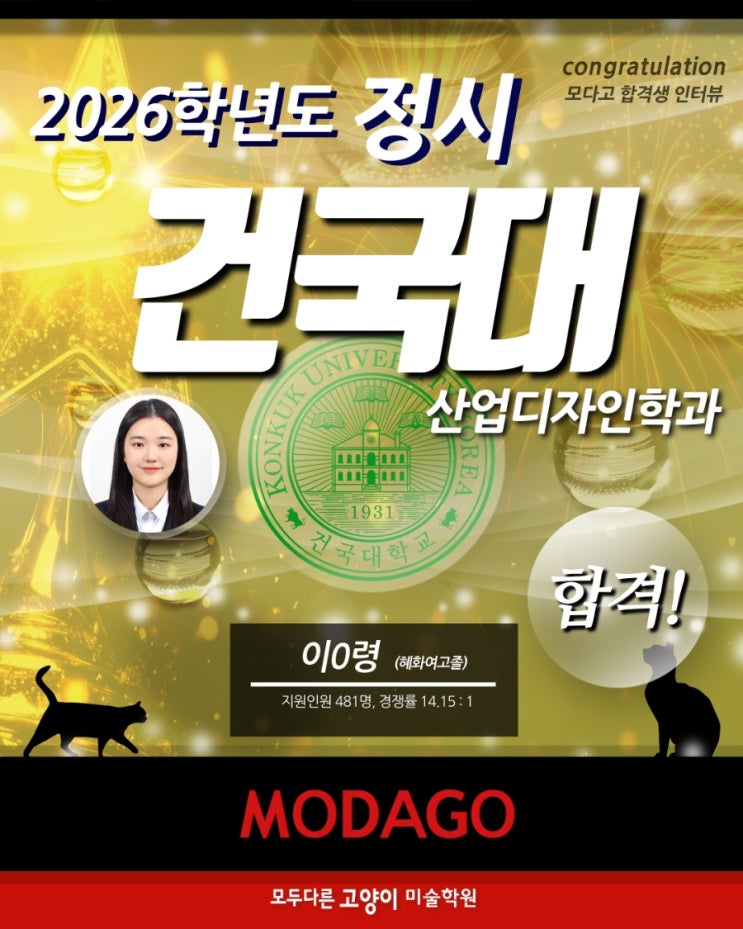 대구 수성구 범어동 미대입시 모두다른고양이미술학원 합격생 인터뷰! ※모다고미술학원은 프랜차이즈가 아닌 대구/홍대앞/일산 본원 단일학원입니다. 2026학년도 정시 건국대 산업디자인학과 합격! 혜화여고 졸 이○령 지원인원 481명 경쟁률 14.15:1 Q. 지원한 대학, 학과, 전형, 지원 동기가 무엇이며 어떻게 준비했나요? A. 건국대학교 산업디자인학과를 정시 다군에 지원했습니다. 평소 공간디자인, 산업디자인에 관심이 많고, 건국대 산업디자인 실기 유형에 흥미가 가서 준비하게 되었습니다. 기출문제와 학원 자체 제작 예상 문항 풀이를 통해 준비했습니다. Q. 학과 관리(내신, 수능)는 평소에 어떻게 준비했나요? A. 국어와 사회, 탐구....... <img src="https://blogthumb.pstatic.net/MjAyNjAzMDNfNjMg/MDAxNzcyNDcwODg4MjMy.OlkhxhwIRGvjHOzsEk81w7s_oJf3r6AVAVe7z9Glk5sg.oVjhXMD4hezFMkuC6pGVWVQ3mB0x6gbba1GLDqMKH6Ig.JPEG/900%A3%DF1772470745692.jpg?type=s3" />