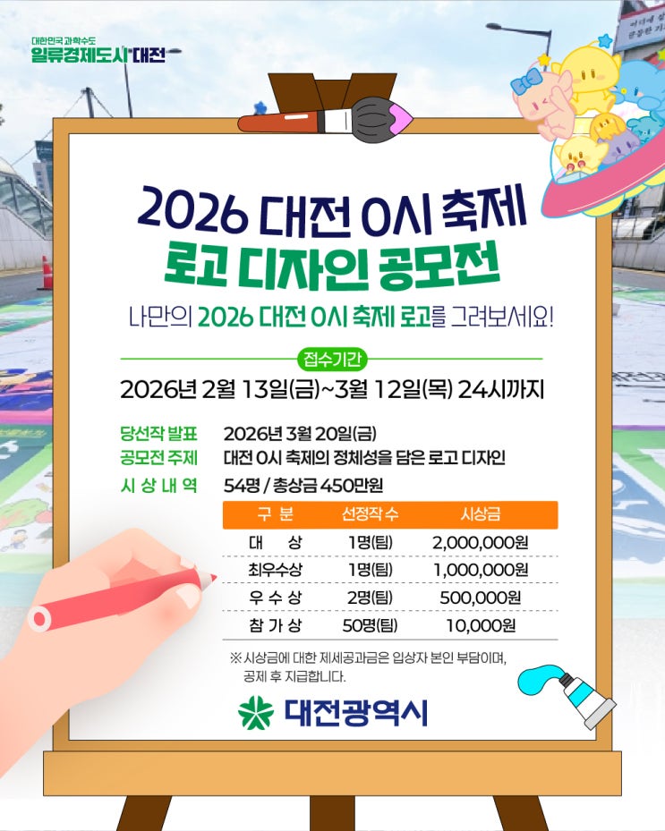 안녕하세요 여러분 미대편입창조 강남캠퍼스입니다 오늘은 대전 0시 축제 로고(EI) 디자인 공모전 을 소개하려고 합니다 대전 0시 축제를 한 장의 로고로 표현한다면? 감성적이든, 미니멀이든, 강렬하든 스타일은 자유, 대전 0시 축제의 정체성을 여러분의 시선으로 완성해 주세요! ○참가자격 연령·지역 제한 없음, 개인 또는 팀 ○접수기간 2026. 2. 13.(금) ~ 3. 12.(목) 24:00까지 ※ 기간 내 제출하지 않을 시 접수 미인정 ○공모주제 대전 0시 축제의 정체성을 담은 로고(EI) 디자인 발굴 ○시상내역 54명, 총상금 4,500천원 (대상 200만원 / 최우수상 100만원 / 우수상 50만원 / 참가상 1만원) ○문의 ▪ 대전광역시 관광진흥과( 270-3998....... <img src="https://blogthumb.pstatic.net/MjAyNjAyMjJfNjQg/MDAxNzcxNzMyMTE0Nzkz.63g0rU-aiECUjuU8LfDjajwh8VOihC1DKauULu1npFog.rwMTf5NJqGHfIJd_mEXTFe3uh6VpW0acTod708v-z9cg.JPEG/202602122040379294943.jpg?type=s3" />