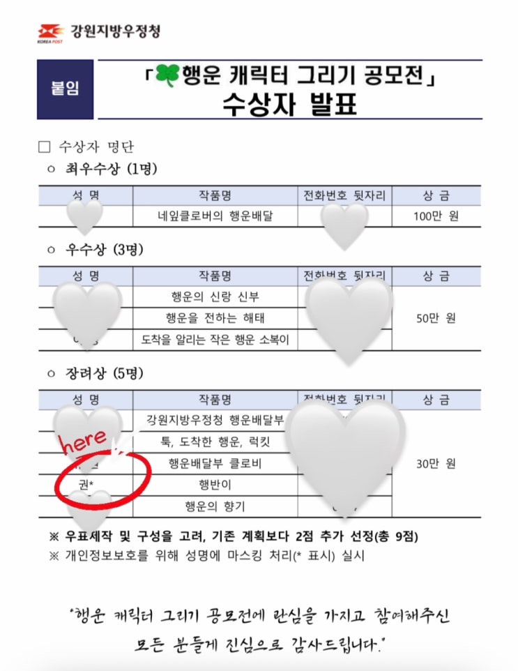 안녕하세요. 무실솔샘 아트앤하트입니다ᡣ • . • ♡ 좋은 소식을 전해드립니다!!~ 이번 2026 강원지방우정청에서 주최한 전국 공모전에서 우리 원주 무실 솔샘 아트앤하트 초등부 학생이 수상했습니다~~ 많은 작품이 출품된 가운데 우리 아이의 작품이 선정되어 더욱 의미 있는 결과입니다. 상 받은 사람들 대부분이 성인과 고등학생, 중학생인데 그 중에 초등학생은 단 한 명 뿐! 행반이는 '행운 반달 가슴곰' 의 뜻에서 이름을 따온 것도 있지만 '행운을 운반한다'에서 이름을 따오기도 했습니다. 머리 위 새는 행반이와 배달을 함께하는 제비입니다. 둘은 둘도 없는 단짝이에요~ 작품 설명까지!!! 정말 너무 멋져....... <img src="https://blogthumb.pstatic.net/MjAyNjAzMTZfMTM0/MDAxNzczNjQwNTc0Njk5.1c1S1BgUg6ZK6YOsIQj32CIFmu-SZYy0whP8vsmwdk0g.gdYAIAj-JnK5YrRls1VkTFVHkGaqs3FWGYecIv5XFHkg.JPEG/KakaoTalk_20260310_194736272.jpg?type=s3" />