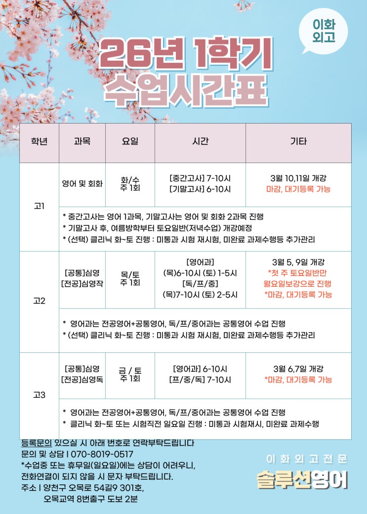 목동 이화외고 영어 26년 1학기 시간표 안내 _ 솔루션 영어