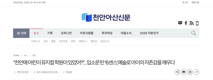 안녕하세요! 천안 6센스 뮤지컬학원입니다. 오늘은 우리 학부모님들과 아이들에게 정말 기쁜 소식을 전해드리려고 해요. 우리 지역 정론지인 <천안,아산신문>에 6센스 뮤지컬학원의 교육 철학이 대서특필되었습니다! 단순히 노래와 춤만 배우는 곳이 아니라, 아이들의 '자존감'과 '리더십'을 키워주는 교육 기관으로 소개되었는데요. 기사에 어떤 내용이 실렸는지 살짝 보여드릴게요! 기사 하이라이트 1: "반장 선거의 비결?" 기사 속 학부모님 인터뷰를 보면, 내성적이던 아이가 학원을 다니며 6개월 만에 자신감을 찾고 학교 임원 선거에 나갔다는 이야기가 나옵니다. 7세 유치부부터 초등 3학....... <img src="https://blogthumb.pstatic.net/MjAyNjAyMTlfNDQg/MDAxNzcxNDc4ODU0NzIx.09hxLUhoW6hTXw4oiht0aMatA35srcDs-u_Z9p7BbCMg.VuhKsu0RdH3tO91o9Jg-6yxVk1bT87CaGFHimKF3f6Ag.PNG/%BD%BA%C5%A9%B8%B0%BC%A6_2026-02-19_%BF%C0%C8%C4_1.50.15.png?type=s3" />