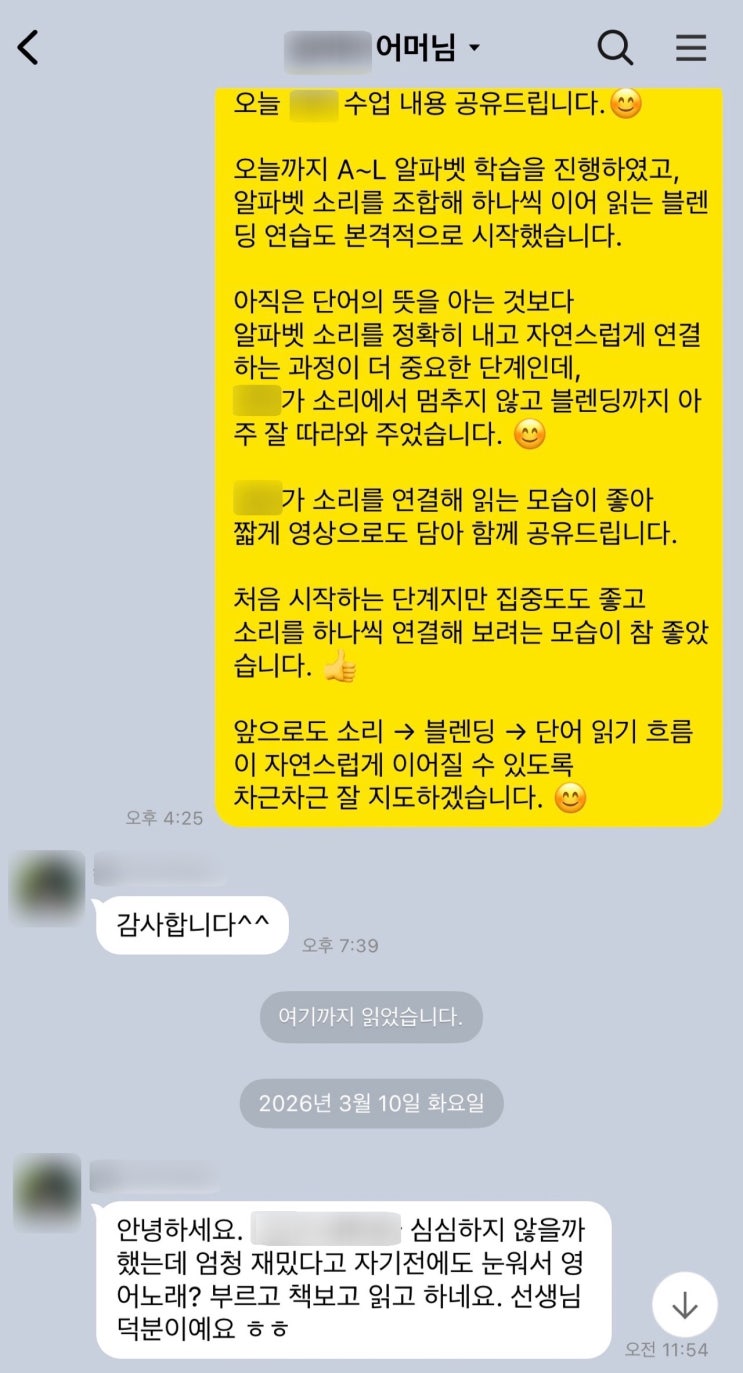3월 신학기, 잘 시작했는지 가장 궁금한 건 당연히 부모님입니다. 3월은 늘 설레면서도 조심스러운 시기입니다. 아이들에게도 새로운 시작이지만, 학부모님께서도 걱정의 마음이 커지는 시기이기도 하지요. 루체테글로벌캠퍼스에서는 걱정마세요. 우리 아이들의 학습 상황을 학부모님께 자주, 구체적으로 공유드리고 있습니다. 단순히 “오늘 수업 잘했습니다”로 끝나는 것이 아니라, 오늘 어떤 내용을 배웠는지 아이가 어느 부분에서 잘했는지 아직 익숙하지 않은 부분은 무엇인지 앞으로 어떤 방향으로 잡아가면 좋을지 이 부분까지 함께 의논드리며 안내드리고 있습니다. 아이들이 잘하고 있는지, 부모님은 당연히 궁금하십니다 학원에 보내....... <img src="https://blogthumb.pstatic.net/MjAyNjAzMTBfMTY5/MDAxNzczMTQ1NTExNDk5.CNitEIpjzhJWuGKmU7auYydxmLn29fsw62jj68rxCpUg.kPVjn13wj3EU_DNa26tAzsWPJtGJXmSZ5d3Fhfn6bMUg.JPEG/KakaoTalk_20260310_211528922.jpg?type=s3" />
