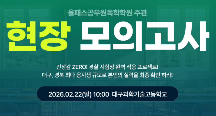 안녕하세요! 2026년 경찰 합격의 꿈을 현실로 만드는 조력자, 대구공무원학원 올패스공무원독학원 입니다. 어느덧 1월의 중반을 지나며, 2026년 3월 14일로 예정되어있는 상반기 경찰공무원 필기시험이 두 달 앞으로 다가왔는데요! 이번 시험은 통합 채용으로 총 6,608명이라는 역대급 인원을 선발하는 만큼, 그 어느 때보다 긴장감과 기대감이 공존하는 시기입니다. 열심히 이론을 회독하고 기출문제를 풀고 계실 여러분께 묻고 싶습니다. "여러분은 지금 실제 고사장의 공기에 익숙해져 있습니까?" 독서실의 익숙한 책상, 집에서의 편안한 환경이 아닌 실제 고등학교 현장에서 느끼는 압박감은 상상 이상입니다. 오늘은 오직 합격만....... <img src="https://blogthumb.pstatic.net/MjAyNjAxMTZfMjg3/MDAxNzY4NTY3Nzg5ODE0.cFFWXdLgIcFAhuqTavNaKvE8HQvdBrxCGLKSOu2uaPAg.TiXRtq7MokSRLSGn0llTEeh2RfwsP7H_7meo3GFc5ycg.PNG/%B0%E6%C2%FB.png?type=s3" />