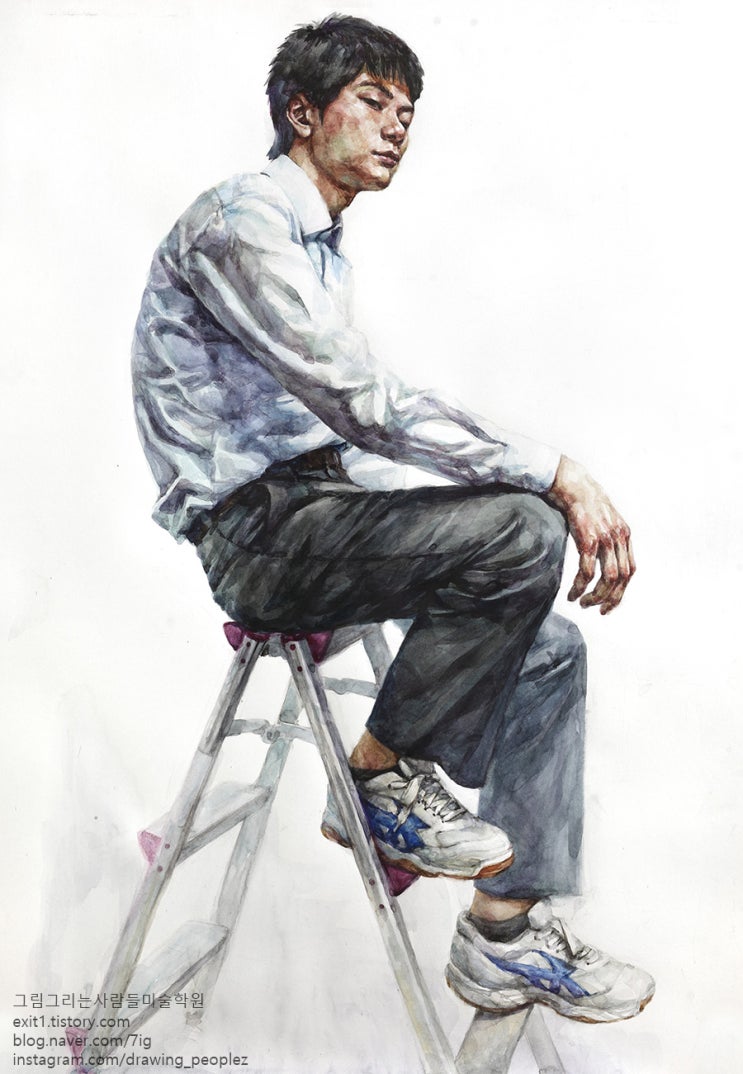 [인물수채화 / 학생작] 흰색 셔츠, 회색 바지를 입고 사다리에 앉은 남성