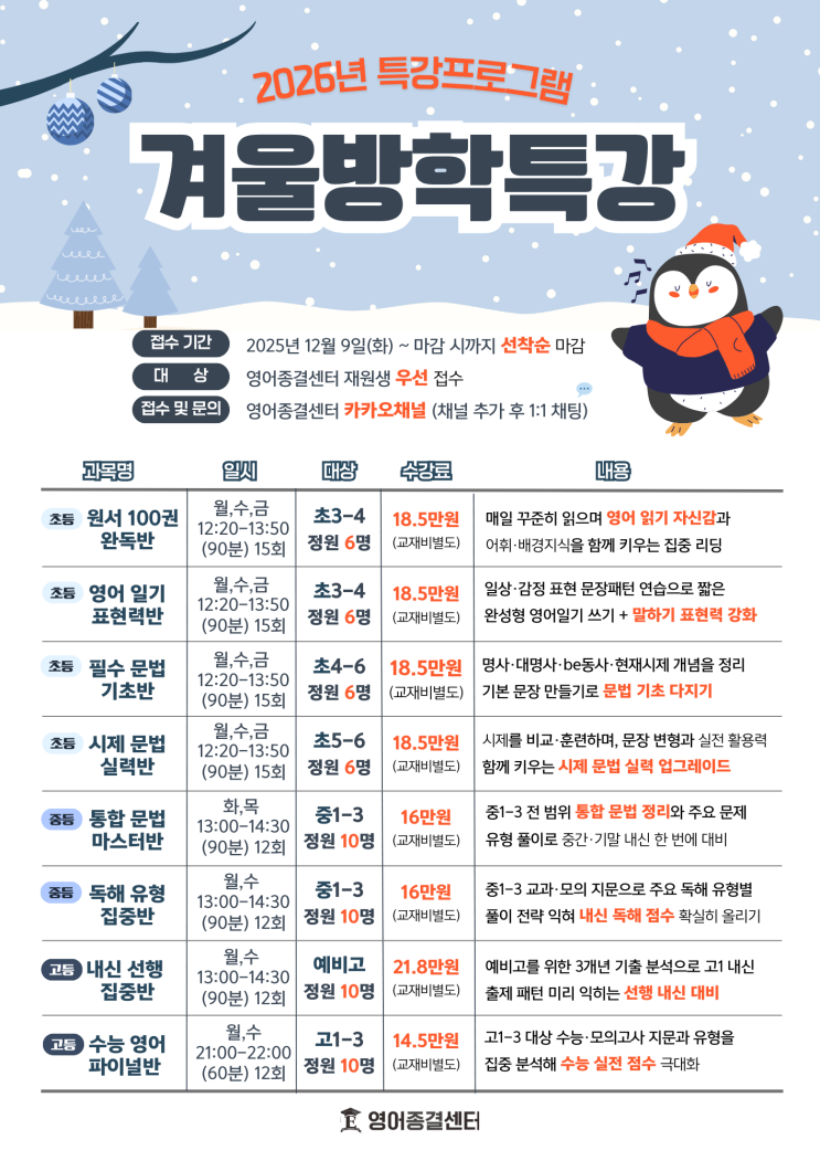 영어종결센터 2026 겨울방학 특강 선착순 등록 마감입니다