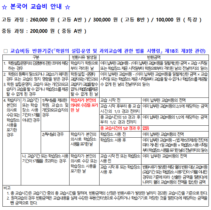 2026 본국어 교습비 안내입니다!