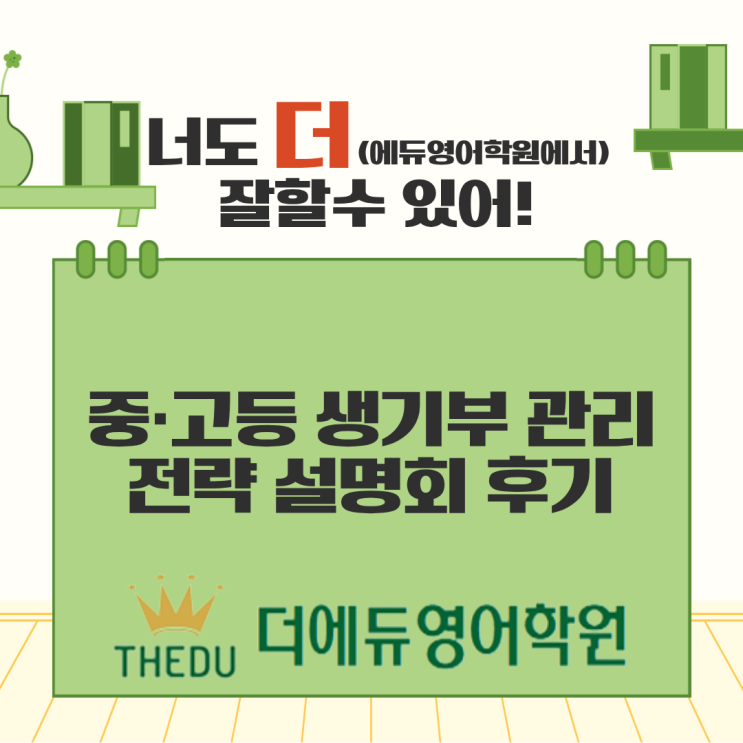 안녕하세요 ~ 더 열정적인 강사진 더 꼼꼼한 학생 관리 더 현명한 학원 선택 망포동 더에듀영어학원입니다 !! 지난 토요일 저희 더에듀영어학원에서 중고등 생기부 관리 전략 설명회가 진행되었습니다. 많은 학부모님들께서 설명회에 함께 해주셨습니다. 귀중한 시간 내주셔서 감사드립니다 !! 그럼 설명회 준비 과정부터 현장 모습까지 한 번 살펴보도록 할까요? 설명회를 준비하며 2028 대입 개편안부터 학년이 바뀌면서 어떤 방향성을 가져야 할지 수많은 고민들을 조금이나마 덜어드리고자 설명회를 기획하게 되었습니다 ! 학년별 생기부 관리 전략에 대해 어떻게 하면 더 잘 전달할 수 있을지 정말 오랜 시간 고민하고 준비했는데요. 이른 시....... <img src="https://blogthumb.pstatic.net/MjAyNjAzMTZfMjcg/MDAxNzczNjUzNjE2NDM5.FeXbQ6827depQF1BZfWvYrJ9PJ82PcCptSkozuCI8pIg.eQ3hjt-vfhq2i4-uYhk4p47nBxWBc1OOOLhlpkHo2X0g.PNG/%B1%E2%C3%E2%BA%D0%BC%AE_%288%29.png?type=s3" />