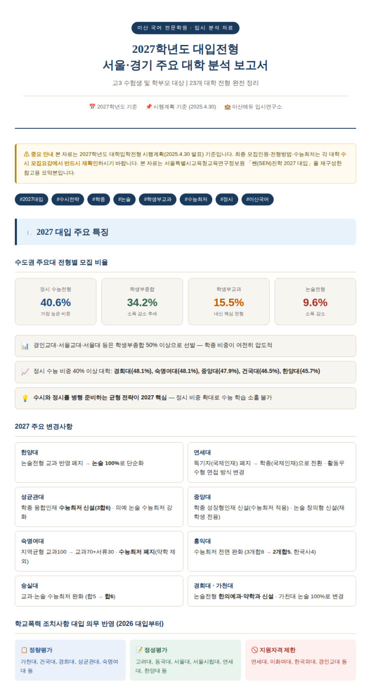 2027학년도 서울 경기 주요 대학 대입 전형 분석