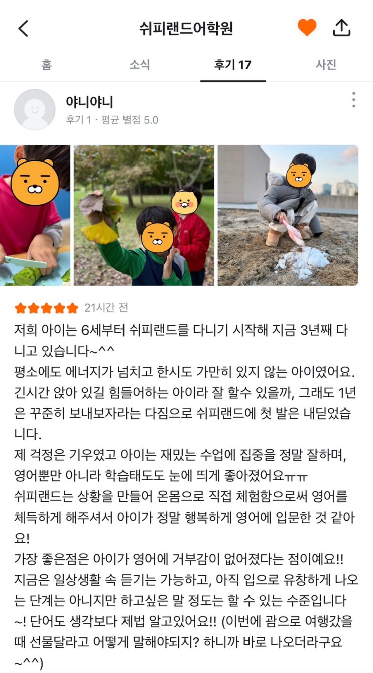 저는 26년간 영어교육에 몸담아 왔고, 그중 12년을 별내에서 오직 영어만 가르쳐 왔습니다. 오랜 시간 한 자리를 지킬 수 있었던 이유는 특별한 마케팅이 아니라, 아이들의 변화 덕분이었습니다. 5년, 4년, 3년… 시간이 증명한 영어 최근 올라온 후기들을 읽으며 저는 한 단어를 떠올렸습니다. “꾸준함.” 6세부터 시작해 지금 3년째 다니는 아이. 4년, 5년을 보내며 졸업까지 함께한 아이들. 그리고 쉬피랜드를 졸업해 미국 사립 중학교에 ESL 과정 없이 입학해 잘 적응하고 있는 아이. 큰 학원 레벨 테스트를 보러 갔다가 상급반 판정을 받고 놀랐다는 어머님의 말씀도 있었습니다. “괜히 미안했다가, 결국 고마웠다”는 그 문장이 제 마음....... <img src="https://blogthumb.pstatic.net/MjAyNjAyMjdfMTA5/MDAxNzcyMTk1NDM1NjM4.iUhLKtEuwFDV9RGOqy65pImw6TRWMIZcIgtmjxALMFIg.FIuBaOvGzEux5JQE8R_QsoFCqIISgUBn1E0rc4VoIGMg.JPEG/IMG%A3%DF2241.jpg?type=s3" />