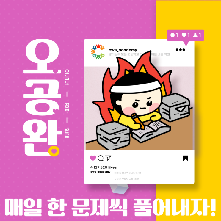 오.공.완 챌린지 안내 안녕하세요! 채원석 학원입니다. 개학 후 공부 습관을 기르기 위한 특별한 도전, 오.공.완(오늘도 공부 완료) 챌린지를 소개합니다. 매일 한 문제씩 꾸준히 풀면서 실력을 쌓고, 성취감을 느낄 수 있는 기회! 또한, 가장 많이 문제를 푼 참가자에게는 소정의 상품도 준비되어 있으니 많은 관심과 참여 부탁드립니다. 오.공.완 챌린지는 3월 23일부터 4월 12일까지 진행됩니다. 고등학교 1학년부터 3학년까지 누구나 참여할 수 있으며, 수학 문제 풀이를 중심으로 진행됩니다. 특히 서술형 및 논술형을 대비할 수 있습니다. 문제 해결 능력을 키우고 논리적인 사고를 연습하는 데 큰 도움이 됩니다. 오.공.완 챌린....... <img src="https://blogthumb.pstatic.net/MjAyNjAzMTZfMjQg/MDAxNzczNjQ0NzY4MzI1.JRf_F_y7WG9tl4aIh3t1-M2yDjvS2AdsYszUf7J87kYg.SDOV67PR_v-dL0cnFOHhU4ylgFrkghQOzUyYVjn55t4g.PNG/KakaoTalk_20260316_145332720.png?type=s3" />